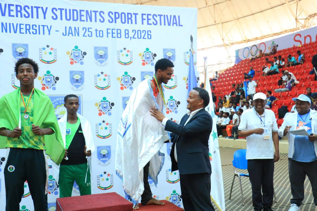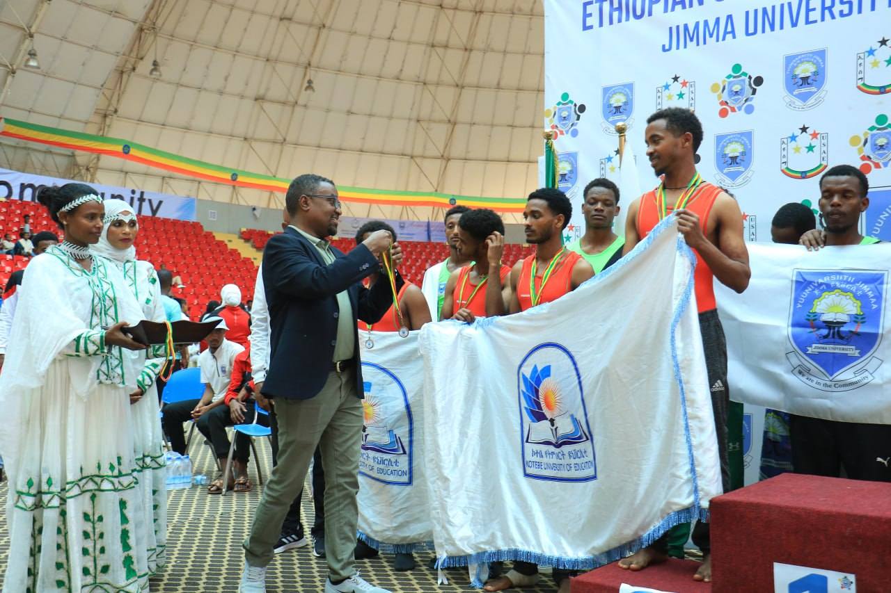 የሜዳሊያ ሽልማቱንም የኢትዮጵያ ዩኒቨርሲቲዎች ስፖርት ማኅበር ፕሬዘዳንት አቶ አባይ በላይሁን እና የጅማ ዩኒቨርሲቲ ፕሬዘዳንት ዶ/ር ጀማል አባፊጣ ለተማሪ ስፖርተኞቹ አበርክተዋል።