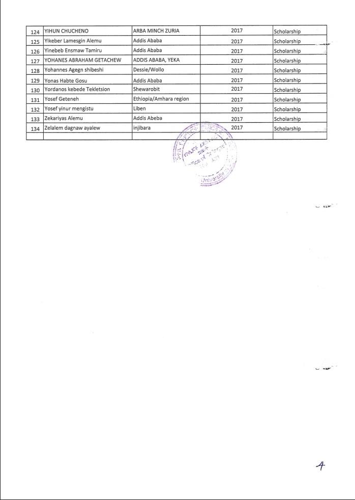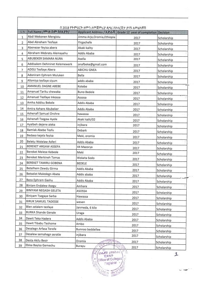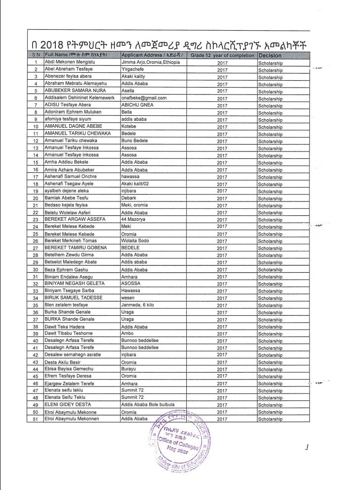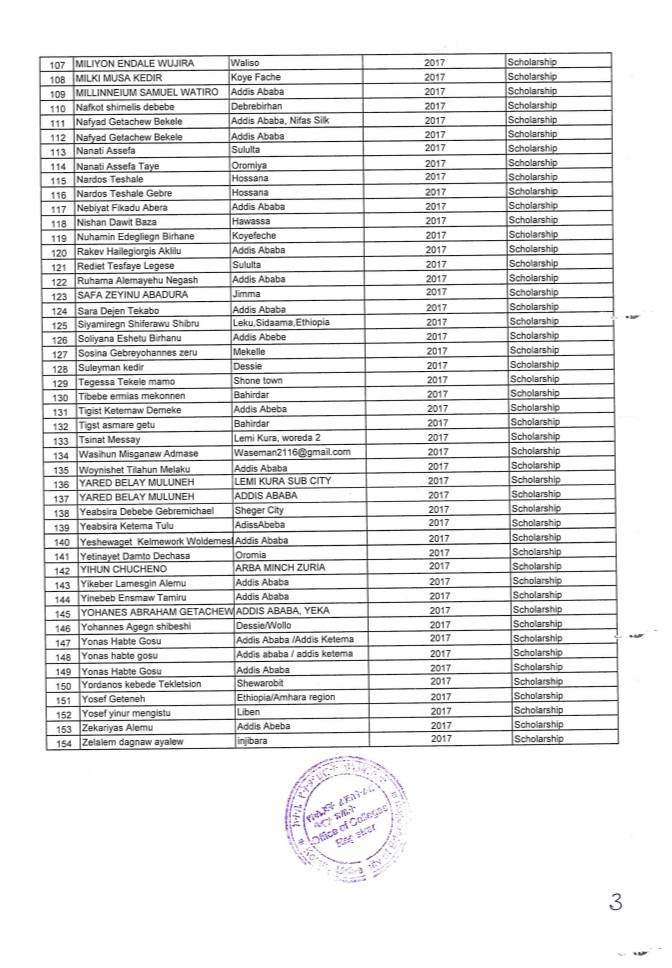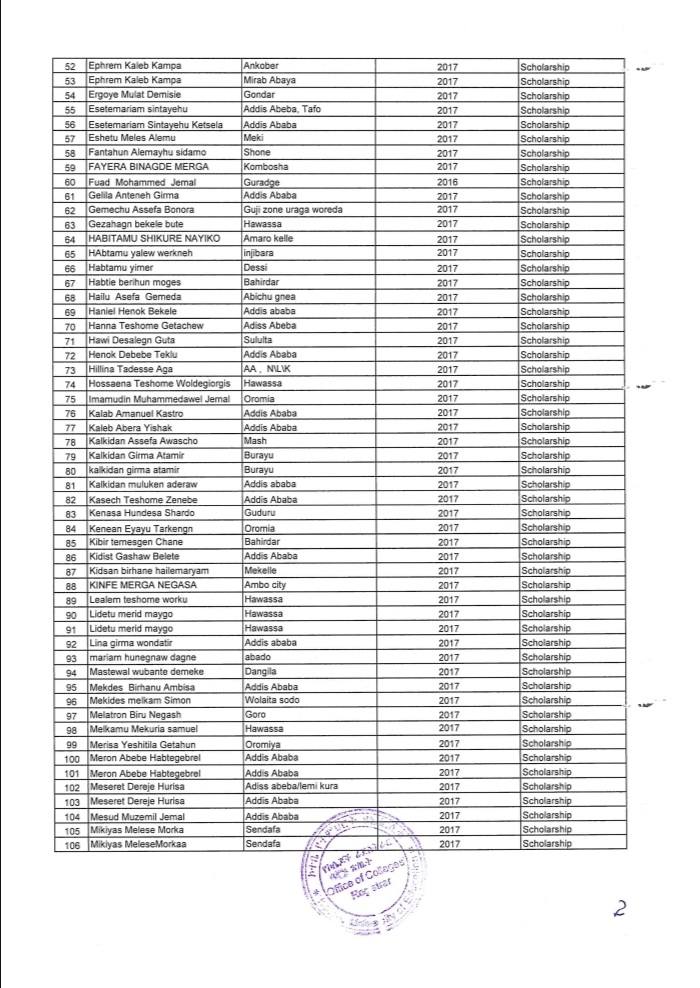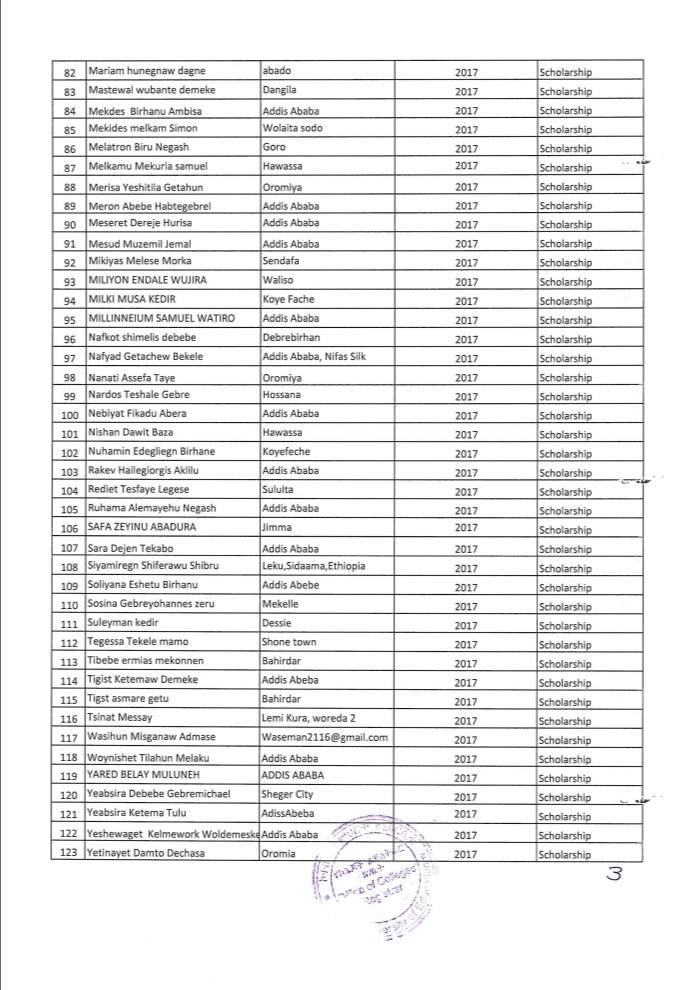 ኮተቤ የትምህርት ዩኒቨርሲቲ በ2017 ዓ.ም ሀገር አቀፍ ፈተና የማለፊያ ውጤት ላመጡ ተማሪዎች ባወጣው ልዩ የስኮላርሺፕ ፕሮግራም የተመረጡ ተማሪዎች ዝርዝር