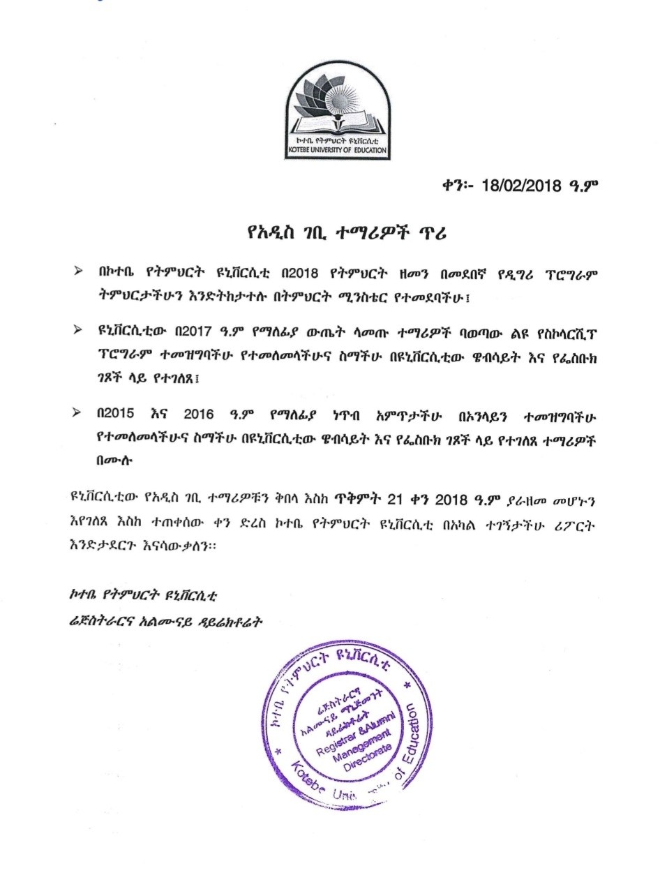 Read Moreበ2016 የትምህርት ዘመን የ12ኛ ክፍል መማጠቃለያ አገር አቀፍ ፈተና ወስዳችሁ አልፋችሁ ለ2017 የትምህርት ዘመን ኮተቤ የትምህርት ዩኒቨርሲቲ የተመደባችሁ ተማሪዎች በሙሉ ህዳር 04 – 05 ቀን 2017 ዓ.ም በዩኒቨርሲቲው ግቢ በአካል በመገኘት ሪፖርት እንድታደርጉ እናሳውቃለን፡፡