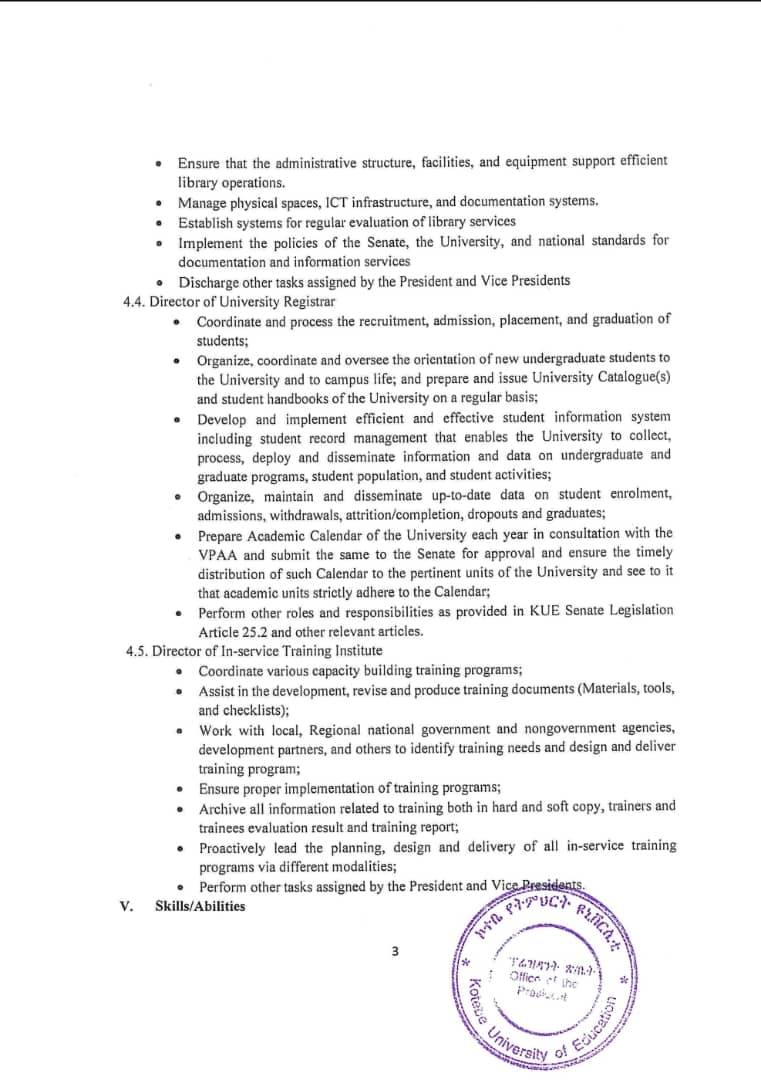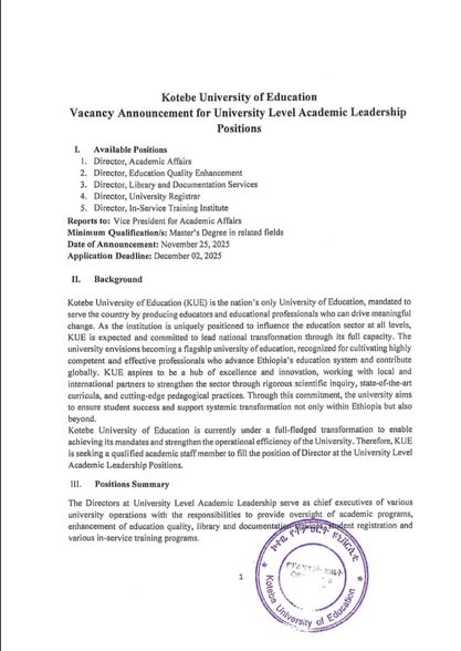 Kotebe University of Education Vacancy Announcement for University Level Academic Leadership Positions:👇